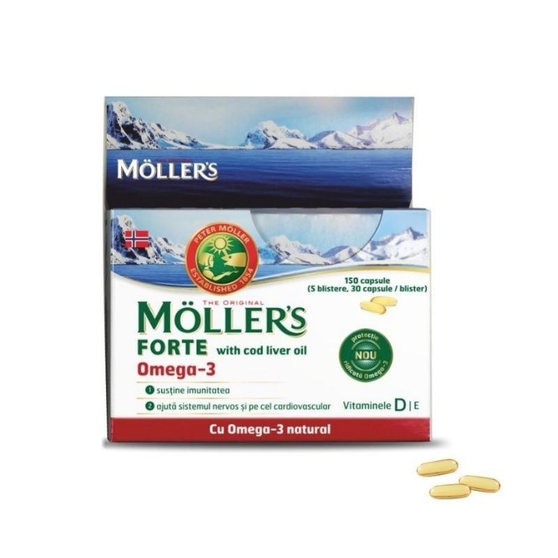Beneficii Moller`s Forte with cod liver oil Omega-3:Ajută la menținerea sănătății și susține imunitatea!2 capsule, doza zilnică recomandată, conțin 900 mg ulei de pește concentrat și 300 mg ulei de ficat de cod bogat în acizi grași esențiali Omega-3 (DHA și EPA) precum și în vitamina D – 400 UI și vitamina E – 10 mg. EPA și DHA contribuie la funcționarea normală a inimii*. DHA contribuie la menținerea vederii normale și a funcției normale a creierului**.Vitamina D contribuie la funcționarea normală a sistemului imunitar și la menținerea sănătății sistemului osos și a dințilorVitamina E contribuie la protejarea celulelor împotriva stresului oxidativ.Ajută sistemul nervos și pe cel cardiovascular!Este dovedit clinic că acizii grași esențiali Omega-3 (EPA și DHA) contribuie la funcționarea normală a inimii. DHA contribuie la dezvoltarea cerebrală normală și a vederii.Vitamina D ajută la absorbția și utilizarea normală a calciului, contribuind astfel la menținerea unui sistem osos normal.*efectul benefic se obține în condițiile unui consum zilnic de 250 mg EPA și DHA** efectul benefic se obține în condițiile unui consum zilnic de 250 mg DHAMod de administrare Moller`s Forte with cod liver oil Omega-3:Doza zilnică recomandată pentru adulți și copii cu vârsta peste 6 ani – 2 capsule / zi cu o cantitate suficientă de lichid.2 capsule conțin Ulei de pește concentrat900 mgUlei de ficat de cod300 mg Acizi grași Omega-3615 mg – DHA (acid docosahexaenoic)216 mg – EPA (acid eicosapentaenoic)293 mgVitamina D10 μg – 400 UI (200%*)Vitamina E10 mg (83%*)*doza zilnică recomandată conform Directivei 2008/100/EC